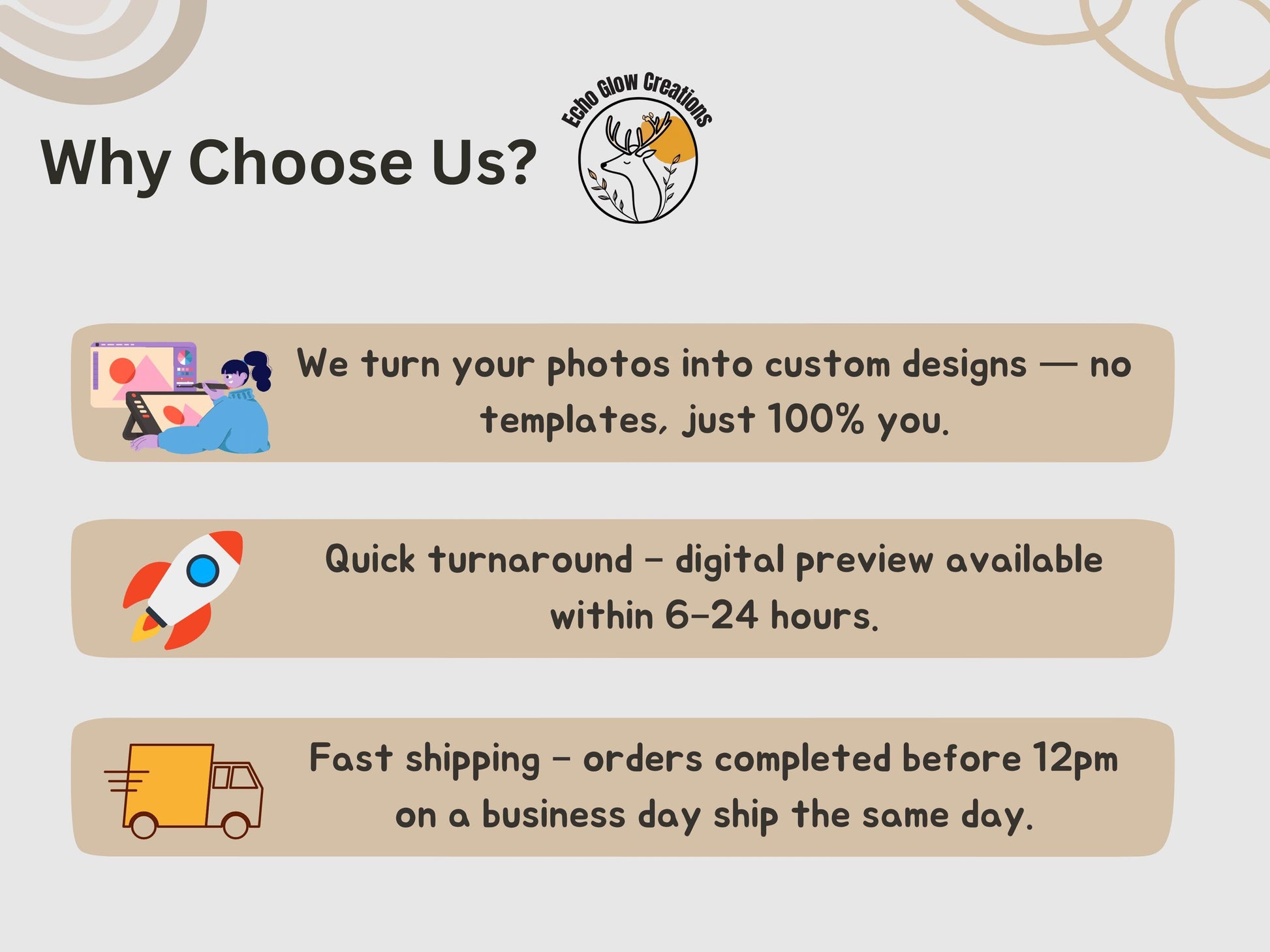 ⌛Important: If we don’t receive a response within 48 hours after the proof is sent, we will proceed with production to meet the shipping timeline.