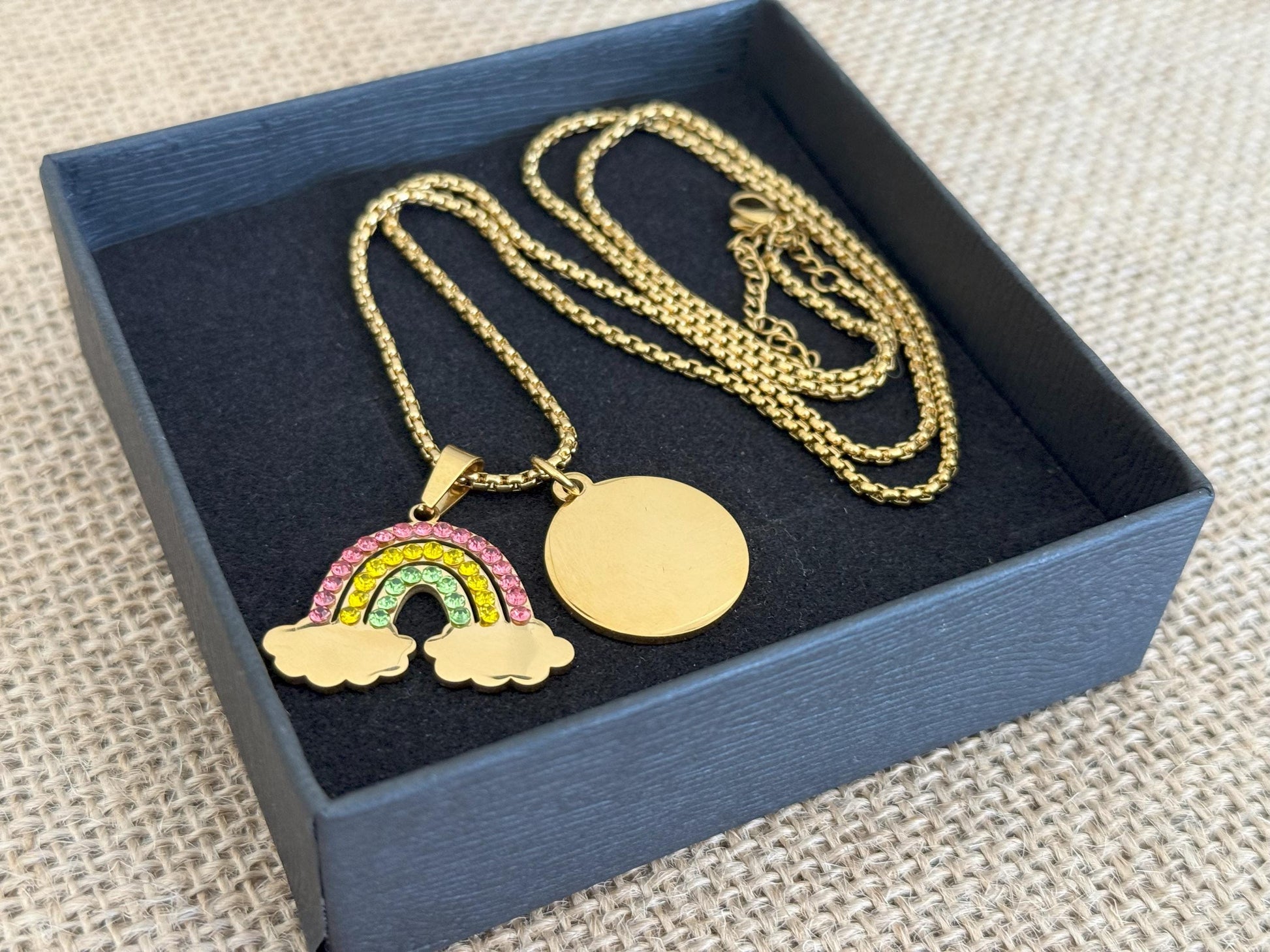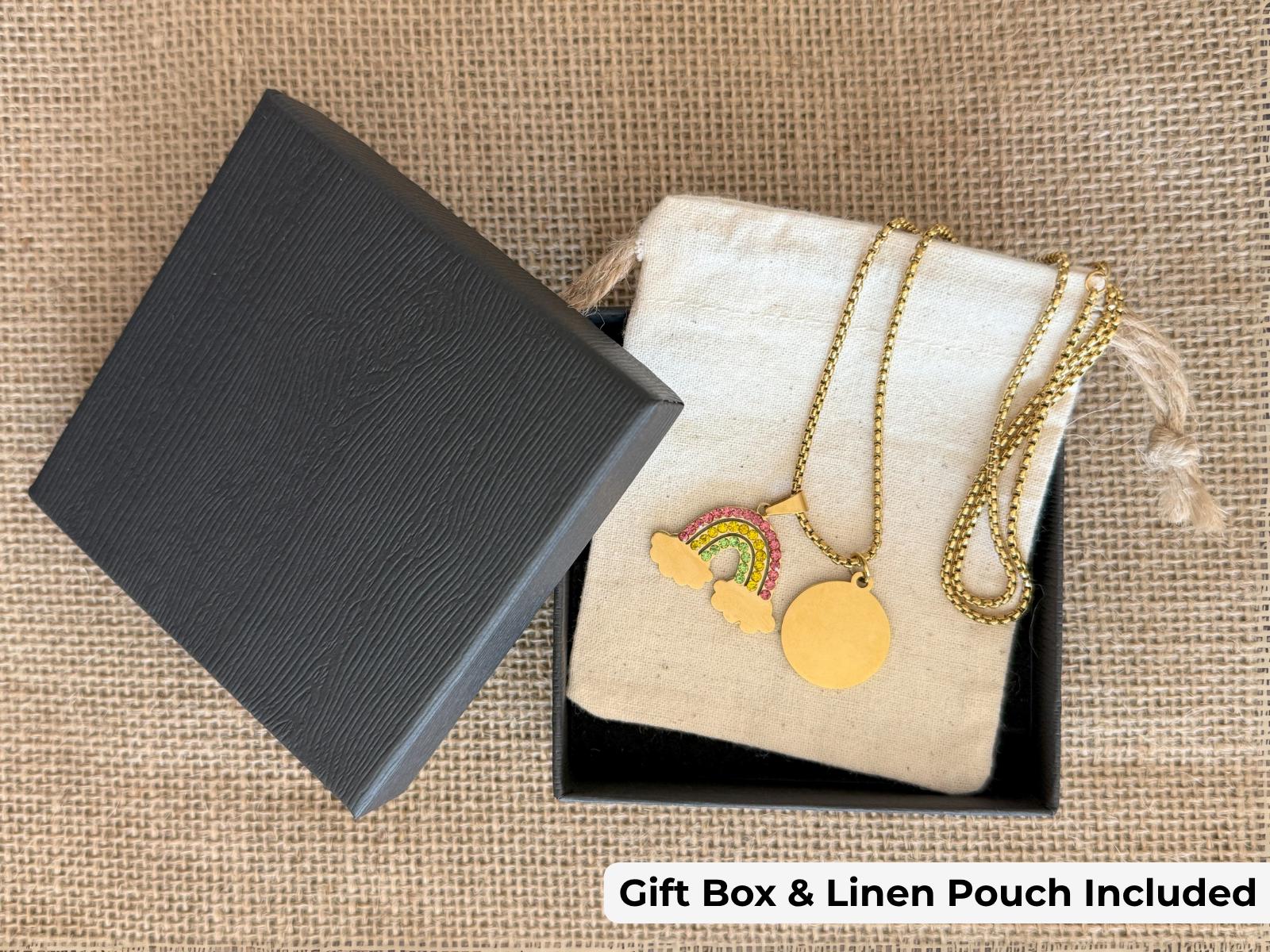 We transform your pet’s photo into a detailed line art portrait and carefully engrave it onto a high-polished gold charm. Paired with a colorful rainbow charm, this necklace makes a meaningful keepsake for pet lovers.