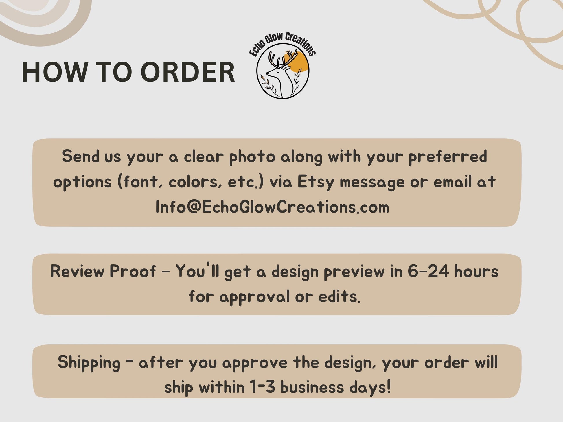 1. Place your order and send us your pet photo(s) via Etsy message or email at Info@EchoGlowCreations.com.