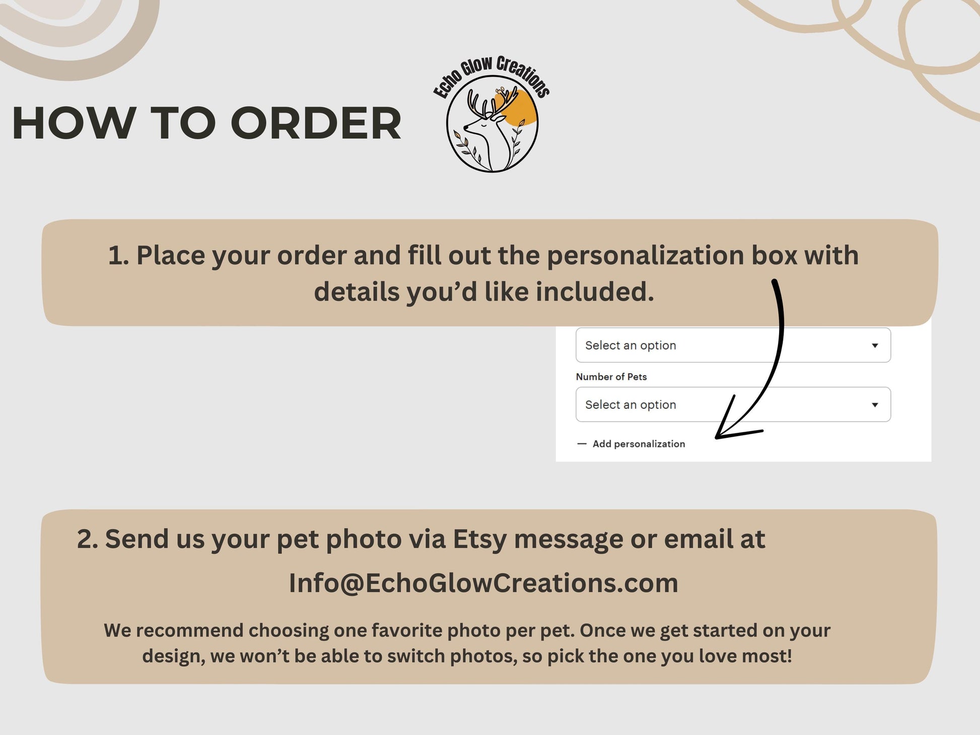 1. After placing your order, please send us your pet photo(s) through Etsy message or email at Info@EchoGlowCreations.com. We recommend choosing one favorite photo per pet. Once we get started on your design, we wonāt be able to switch photos, so pick the one you love most!