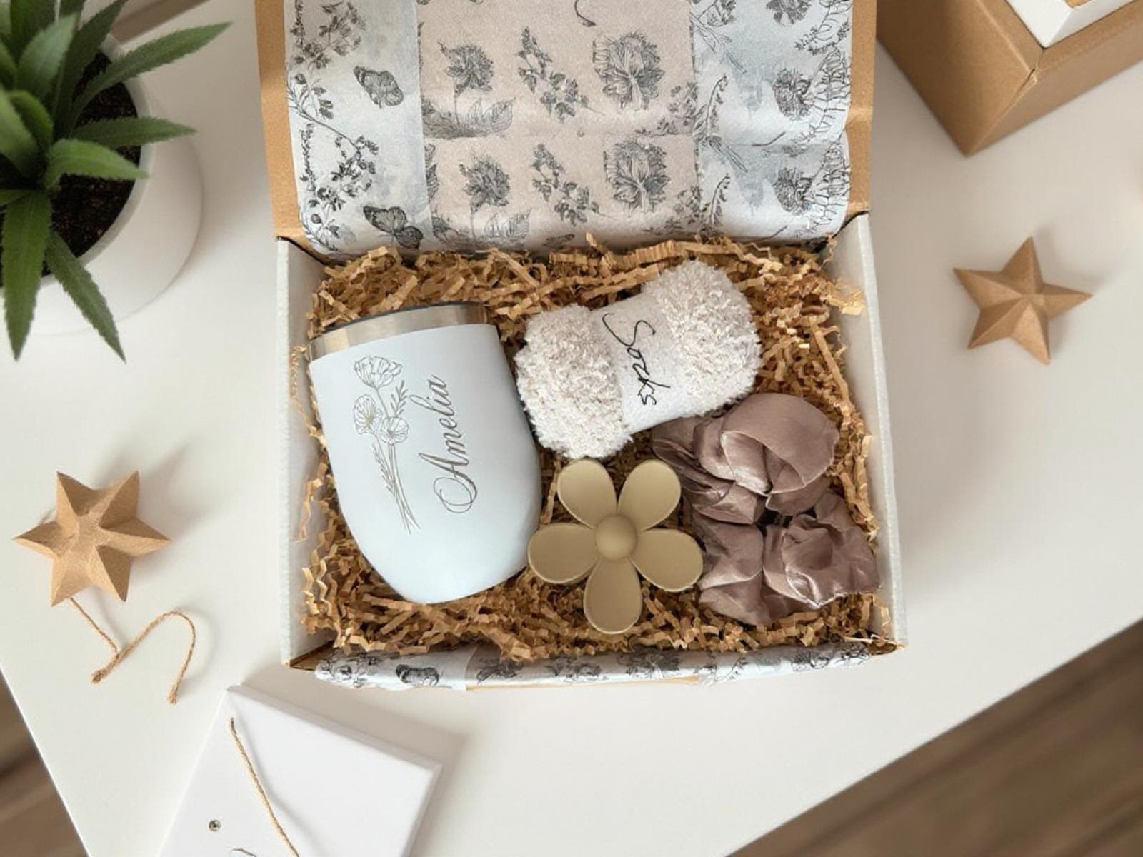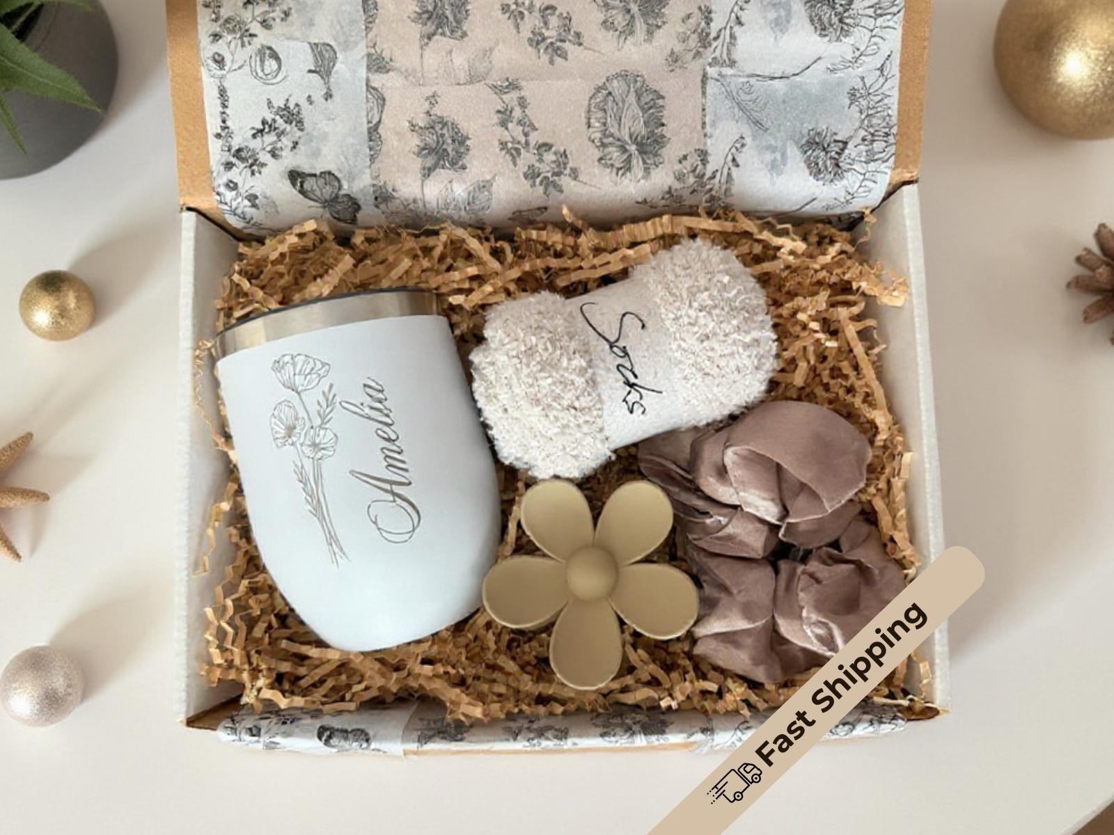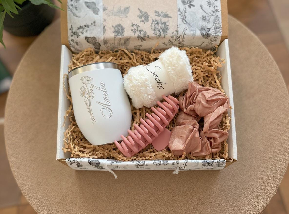 Delight someone special with this thoughtfully curated cozy gift box, perfect for birthdays, holidays, or any self-care moment. Featuring a sleek wine tumbler, ultra-soft fuzzy socks, a stylish scrunchie, and a chic hair clip, this care package is designed to bring warmth, relaxation, and a touch of everyday luxury. 🎁💖